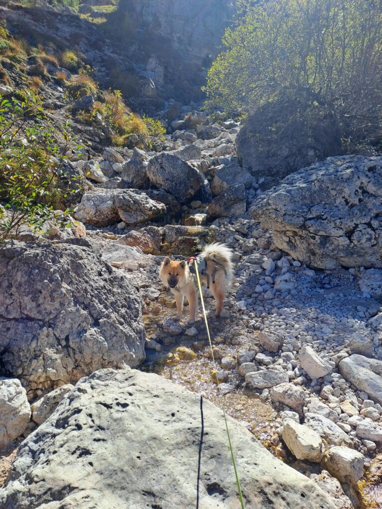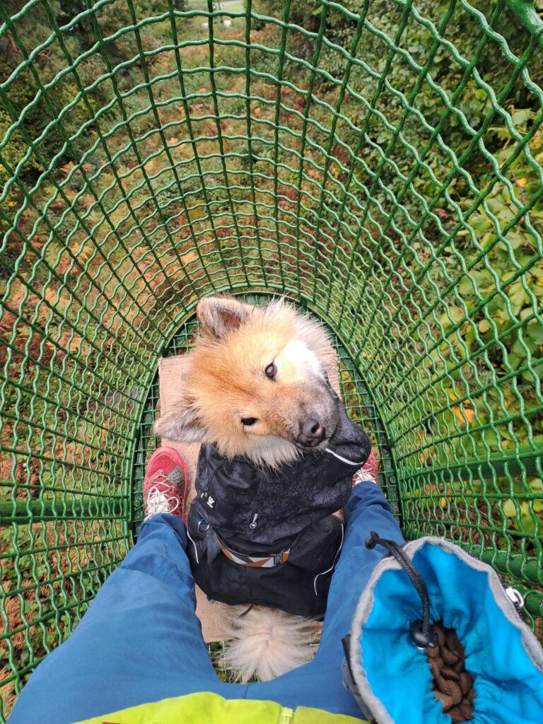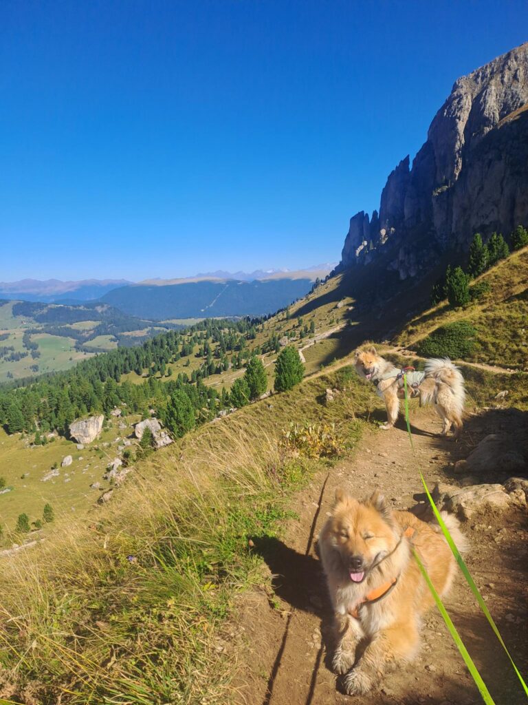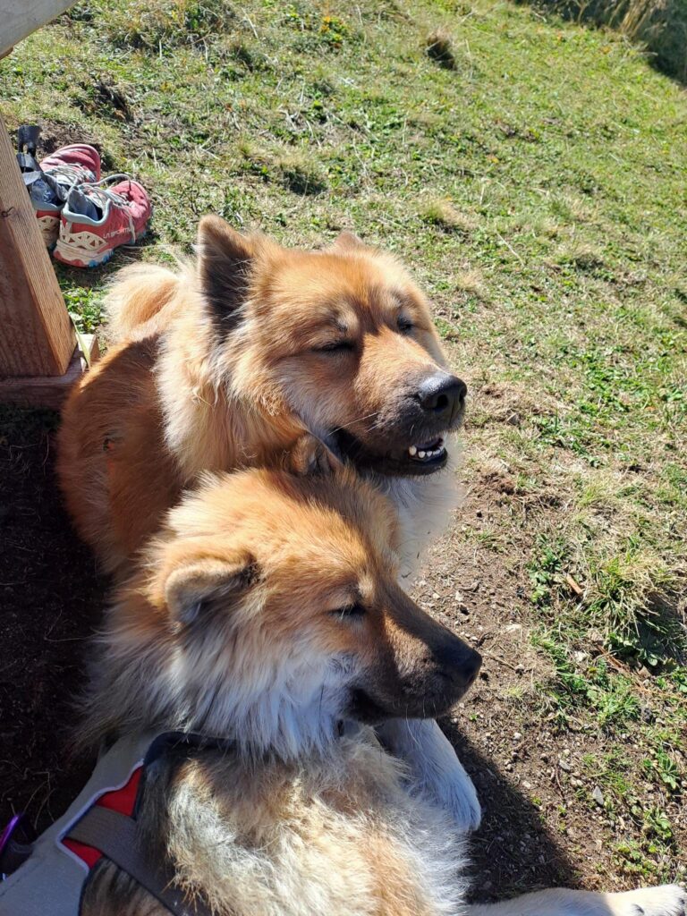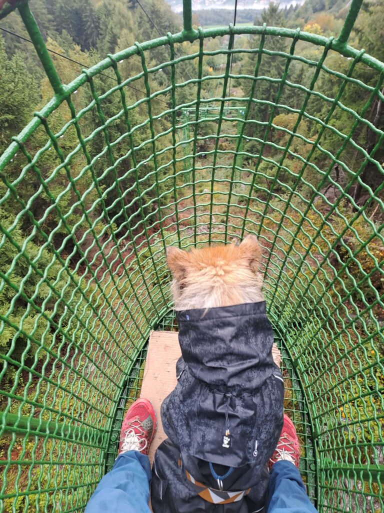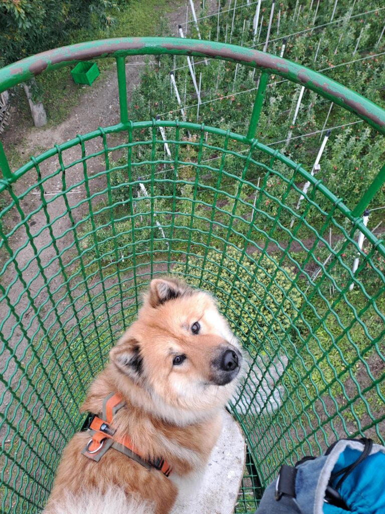 Statt in Dorf Tirol starteten wir beim Gasthaus Gasteiger und ließen uns ganz bequem mit dem Korblift hoch zur Leiter Alm transportieren. Der Lift ist ein ganz besonderes Erlebnis vor allem für die Hunde, denen eine Sonderbehandlung zu Teil wurde: Zum Ein- und Aussteigen wurde der Lift verlangsamt und Pappen als Sicht- und Trittschutz hineingeworfen. Etwas skeptisch wurden die Körbe dennoch von den Vierbeinern betreten, doch schnell stellten sie fest, dass diese Art des Reisens auch ganz nett war – entspanntes Umgebungsscannen.