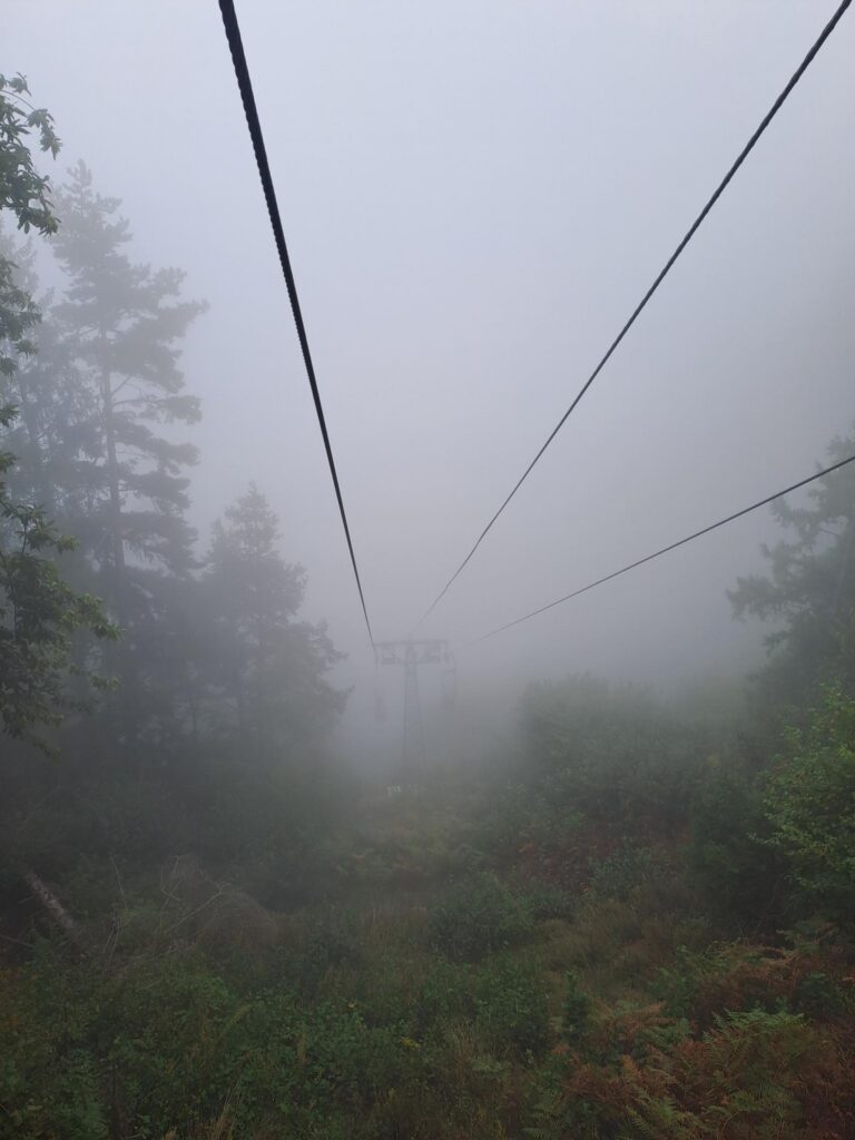 Auf 1550 Metern Höhe angekommen, begannen wir unsere über 1100 Höhenmeter und 14 Kilometer lange Tour bei wunderschönem Schlechtwetter. Mal gab es ein wenig Aussicht, dann wieder nicht. Mal gab es ein wenig Wind, dann mal wieder nicht. Mal gab es Sprühregen, dann mal Nieselregen, dann mal Regen – dann mal auch nicht.